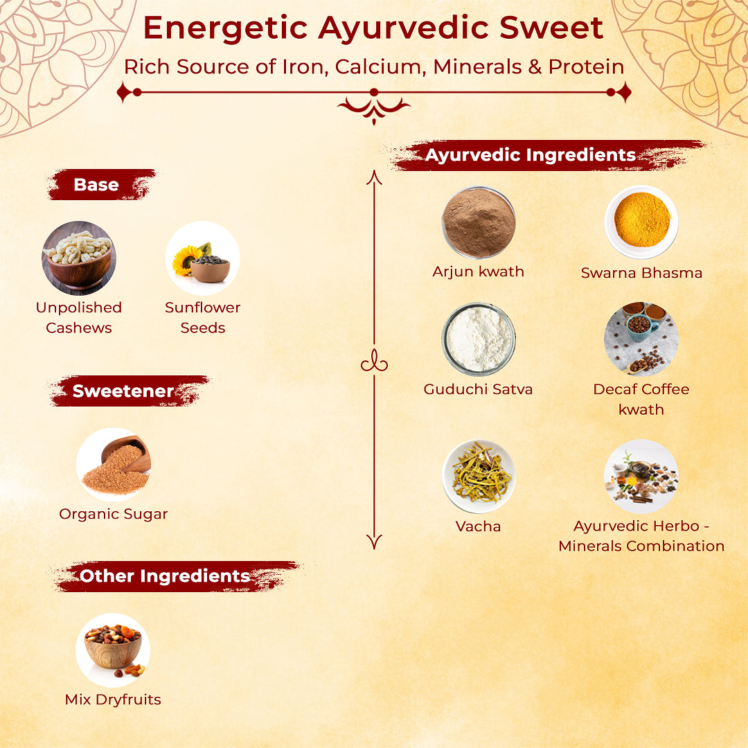 Arjun kwath, decaf coffee kwath, Swarna Bhasma, Guduchi Satva, Vacha and Herbo-Minerals Combination.